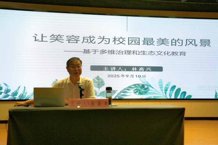 随后,院党委书记林高兴以《让笑容成为校园最美的风景》为主题作专题讲座,从政治意识维度、组织归属建设、工作规则优化、社会关系培育、廉洁自律建设、生活品味提升、心理调适机制、环境生态营造、文化浸润工程和实践路径与保障体系等多方面,深入阐述了如何构建一个多维、全面的“微笑校园”治理体系,实现教育回归幸福本质。