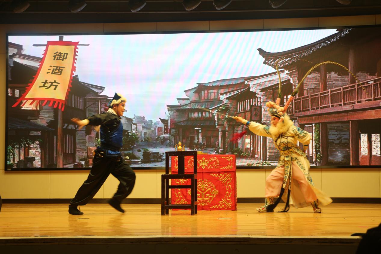 活动在安徽省泗州戏剧院专业演员的精彩展演中拉开帷幕。经典折子戏《挡马》率先登场,杨八姐与焦光普智斗的剧情扣人心弦,利落的武打身段、精准的刀枪对打,尽显泗州戏武戏风采;荒诞喜剧《马孤驴换妻》以通俗诙谐的唱词演绎马孤驴贪图美色换妻后的闹剧,引得全场笑声不断;《垓下轶事》则以“霸王别姬”为背景,用婉转悲怆的唱腔演绎虞姬为免项羽后顾之忧、拔剑自刎故事的桥段更是打动全场。三场风格迥异的剧目,全方位呈现了泗州戏“刚健质朴、活泼诙谐”的独特风格,鲜活展现皖北民俗风情,极具生活气息的演绎赢得现场阵阵掌声,让师生近距离领略了这一皖北传统剧种的艺术魅力。