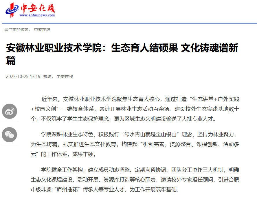 近日,省级媒体“中安在线”对我院生态文化教育工作进行了报道。近年来,安徽省林业局深入学习贯彻习近平生态文明思想和习近平文化思想,积极践行“绿水青山就是金山银山”理念,牢牢把握新时代新的文化使命,紧紧围绕生态文明建设实践,大力培育和弘扬林...
